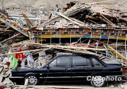 4月16日,青海玉树结古镇新建路一处地震废墟,一辆汽车被严重掩埋。中新社发 廖攀 摄
