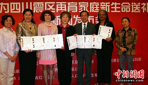 5月6日,四川汶川“5·12”特大地震两周年前夕,中国红十字基金会和谐家庭公益基金在北京向四川震后再育家庭新生儿代表赠送爱心礼包。23位驻华女大使或使节夫人以书面形式向这一慈善公益活动送来温馨祝福。图为黑山驻华大使莉尔雅娜·托什科维奇(左三)、巴哈马驻华大使艾尔玛·坎贝尔(右二)等现场展示她们对四川震区的祝福词。中新社发 孙自法 摄