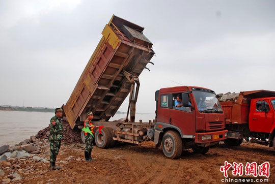 6月25日,大批工程车辆运载石料,准备封堵江西抚州唱凯决堤口。据悉,武警水电二总队官兵正在抚河大桥岸边紧张作业,为抚州唱凯大堤堵口复堤工程开辟进出专用通道。唱凯决口大堤将在当日开始封堵,计划决战六天堵住决口。中新社发 刘占昆 摄