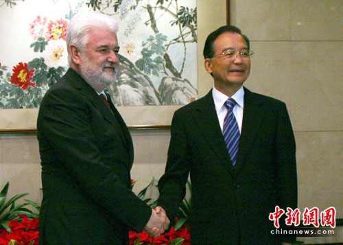 6月25日,中国国务院总理温家宝在浙江省杭州市与塞尔维亚总理茨韦特科维奇举行会谈。中新社发 赵晔娇 摄