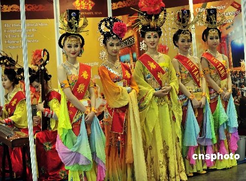 六月十一日,第二十三届香港国际旅游展在香港会展中心开幕。图为来自西安唐乐宫的女模特在现场推广旅游。 中新社发 谭达明 摄
