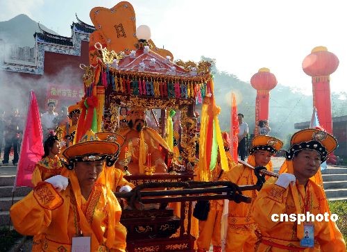 6月19日,数百名闽王后裔在福建福州晋安区新店镇莲花山下闽王陵园内举行盛大起驾仪式,欢送闽王王审知金身首次跨海巡安台湾本岛。当日,应台中县王姓宗亲会邀请,福州市闽王金身赴台巡安暨宗亲文化交流访问团一行85人护送闽王金身循“两马”航线赴台湾岛内进行为期10天的巡安活动。 中新社发 刘可耕 摄