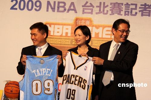 6月19日,NBA在台北举行记者会,宣布10月8日首度在台北举行一场季前赛,由丹佛掘金队对阵印第安纳步行者队,全明星球员安东尼、比卢普斯等将出战。图为台北市长郝龙斌(左)、台湾“体委会”主委戴遐龄(中)出席记者会,获赠NBA球衣。中新社发 董会峰 摄
