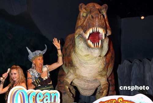 六月二十三日 香港海洋公园主席盛智文以“恐龙大帝”的身份率领传媒及嘉宾参观“恐龙皇国与石器水世界”新景点。七月至八月暑期来临之际,海洋公园推出逾六十个特色景点及超过四十场精彩表演,力求成为香港热爆亮点。中新社发 洪少葵 摄