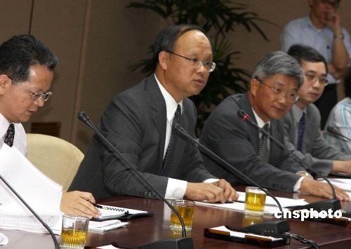 6月30日下午,台湾“经济部”公布大陆资金来台许可办法,第一阶段将开放一百项,即日起正式受理陆资来台投资或设立办事处的申请。大陆企业有兴趣的中草药、面板、半导体及营造业,则不在首阶段开放之列。图为台“经济部”政务次长邓振中(左二)等在记者会上作说明,并回答记者提问。中新社发 董会峰 摄