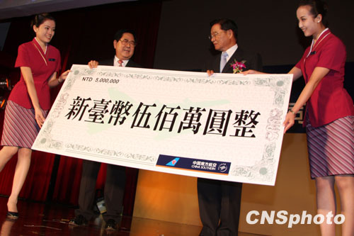 8月13日下午,在南方航空台湾分公司成立酒会上,南航宣布从预备金中紧急动支1000万元新台币,首笔500万,用以帮助台湾水灾中受创民众。图为南航董事长司献民(左二)将模拟支票交与台湾海基会董事长江丙坤。中新社发 董会峰 摄