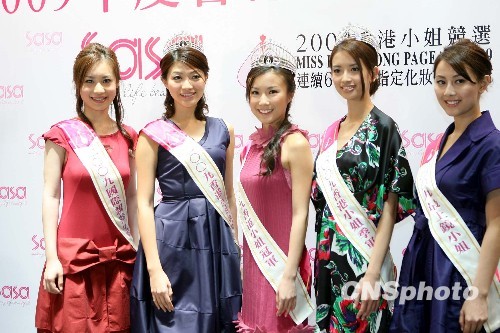 八月二十八日,新一届香港小姐冠军刘倩婷(中)、亚军李姿敏(左二)、季军熊颖诗(右二)及国际亲善小姐黄嘉丽、最上镜小姐袁嘉敏在旺角新世纪广场亮相,出席一家化妆品公司颁发奖品。连日来,出炉港姐马不停蹄频频出席赞助商活动,领取丰富奖品。中新社发 洪少葵 摄