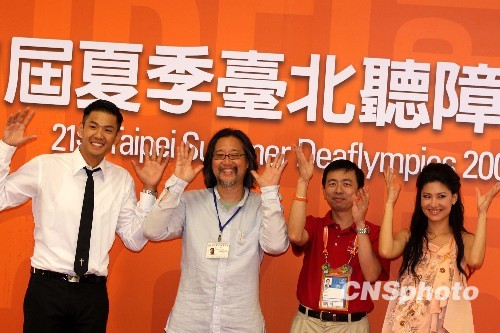 9月2日晚,第21届听障奥运会开幕大典总彩排,因为暴雨被迫中途取消。图为总导演赖声川(左二)、台北听奥筹委会基金会总执行长盛治仁(左三)、主持人“黑人”陈建州(左一)及周瑛琦参加主媒体中心记者会,感谢当晚表演者的敬业精神及观众的热情。中新社发 董会峰 摄