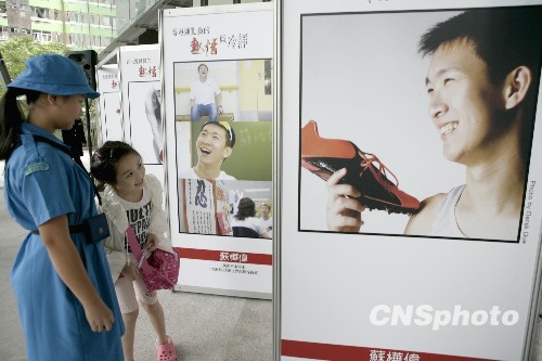 十月十八日,由香港民政事务局筹建的青年广场,举行开放日,呈现包括香港漫画历史展览、香港运动员相片展等丰富多彩的表演活动,香港政府特别筹建这个全港性的青年广场,以凝聚全港的青年发展活动,提升香港青年人的素质。图为香港运动员相片吸引了学生的视线。中新社发 张勤 摄