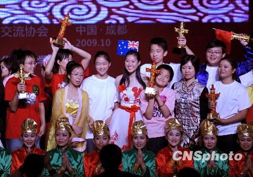 10月21日,世界华文教育大会举办的首届中华文化知识竞赛总决赛圆满落幕,来自世界各地的华人青年选手获得华表造型的奖杯。 中新社发 廖攀 摄