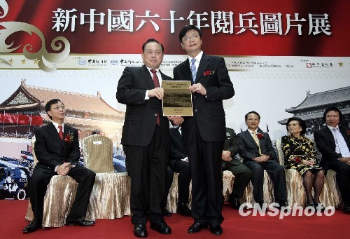 10月27日上午,由中国新闻社主办的《新中国60年阅兵图片展》在香港沙田新城市广场隆重举行开展礼。中新社社长刘北宪[右]向香港侨界社团联会余国春会长赠送纪念品。中新社发 张勤 摄