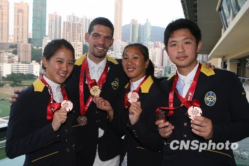 十月二十九日,参加第十一届全运会的香港马术队载誉抵港受到热烈欢迎。由香港赛马会马术队成员林立信(左二)、郑文杰(右一)、林子心(右二)及青少年马术队成员赖桢敏组(左一)成的香港马术队,于第十一届全国运动会首度取得马术项目奖牌,共夺得一金两铜的佳绩,为香港马术运动史写下光辉一页。中新社发 郑祚声 摄