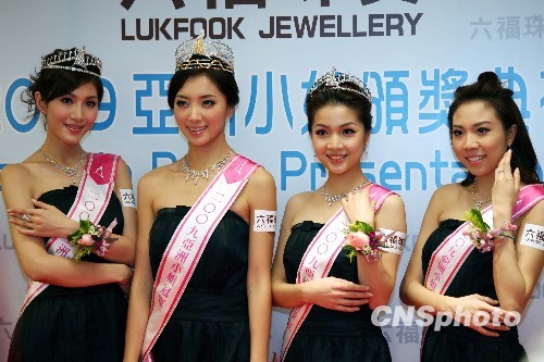 十一月五日,应届亚洲小姐冠军许莹(左二)、亚军王希瑶(左)、季军许嘉慧(右)及友谊小姐张加慧到香港六福珠宝领取金钻皇冠和名贵珠宝首饰。中新社发 洪少葵 摄