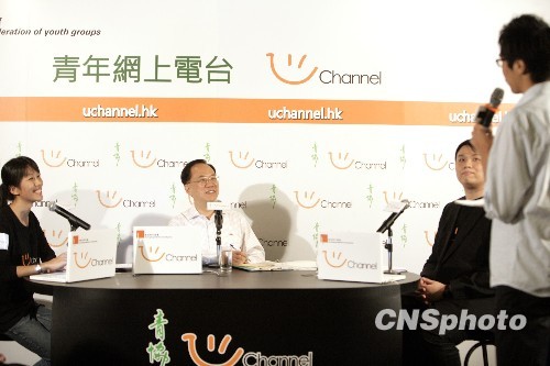 香港青年协会青年网上电台uChannel成立一周年,特别邀请香港特区行政长官曾荫权出席担任《青年会客室》节目之嘉宾,并与现场近来自《香港200》领袖计划学员分享其施政之道。 图为曾荫权回答学生的提问。中新社发 张勤 摄