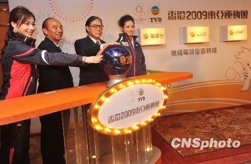 十一月二十七日,香港无线电视举行“香港2009东亚运动会”全面转播记者会,并现场直播多项精彩比赛项目。港协暨奥委会会长霍震霆(右二)、香港东亚运行政总裁胡伟民(左二)与香港小姐季军熊颖诗(右一)、国际亲善小姐黄嘉丽共同主持亮灯仪式,标志着无线电视正式为市民全面报道香港2009东亚运动会有关盛况。中新社发 邓庆乐 摄