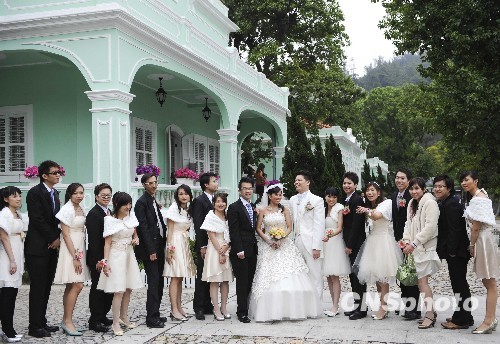 12月17日,澳门凼仔海边马路龙环葡韵住宅式博物馆前,一对新人邀约亲朋好友拍摄婚纱照片。中新社发 廖攀 摄