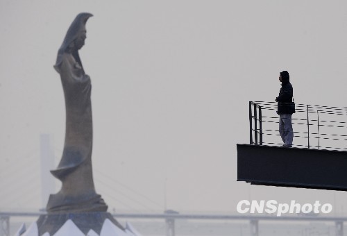 12月19日,一位路人在澳门观音像附近的过街天桥上观景。中新社发 廖攀 摄