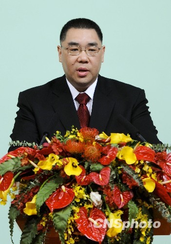 12月20日,庆祝澳门回归祖国十周年大会暨澳门特别行政区第三届政府就职典礼在澳门东亚运动会体育馆举行。澳门特区第三任行政长官崔世安在大会上致辞。中新社发 廖攀 摄
