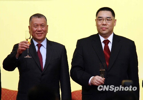 12月20日下午,澳门特区政府在观光旅游塔举行“庆祝特区政府成立十周年酒会”,刚刚宣誓就职的特区行政长官崔世安[右]、卸任行政长官何厚铧等出席。中新社发 洪少葵 摄