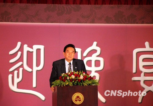 12月21日,大陆海协会会长陈云林一行抵达台中市,图为陈云林在海基会欢迎晚宴上致辞。中新社发 陈立宇 摄