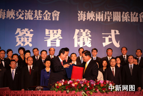 图为海协会会长陈云林签署协议后与海基会董事长江丙坤互换文本。陈立宇 摄