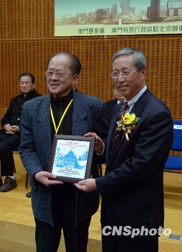 1月12日,第三届“我心中的澳门”全球华文散文大赛在澳门举行颁奖典礼。外交部驻澳特派员公署特派员卢树民(右)向一等奖获得者刘登翰颁奖。中新社发 毕永光 摄