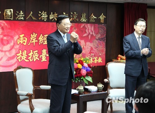 2月8日上午,台湾海峡交流基金会举办新春记者茶叙,董事长江丙坤(左一)对记者说,他今年有四个愿望:凝聚全民大陆政策共识、顺利达成协商任务、以两会交流促成优势互补、海基会办公厅舍早日动工完成。中新社发 耿军 摄