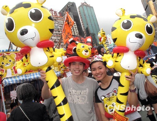 2月11日,香港维园花市呈现一派喜气洋洋的迎新年气氛,图为活泼可爱的卡通虎惹人喜爱。中新社发 张勤 摄