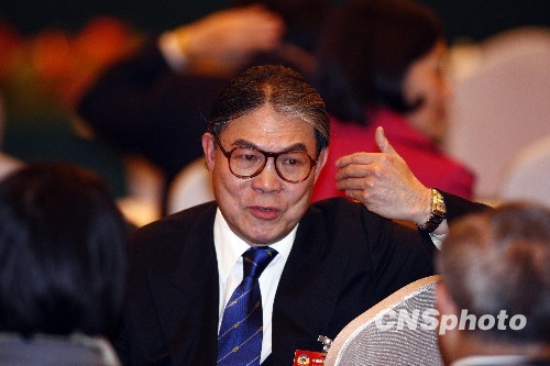 3月4日,全国政协委员霍震霆出席全国政协十一届三次会议港澳委员联组讨论时与委员交流。中新社发 杜洋 摄