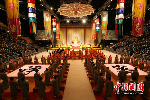 4月10日下午,香港佛光道场假红勘体育馆举行“三皈五戒暨禅净密三修”大型法会,著名高僧大德、宗长星云大师主法。中新社发 郑祚声 摄