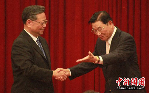5月5日,台湾海基会董事长江丙坤在台北圆山大饭店举行午宴,欢迎福建省长黄小晶率福建省经贸文化交流团来台访问。两位老朋友相见甚欢,期待透过此次访问进一步推动两地全方位交流合作。中新社发 罗钦文 摄