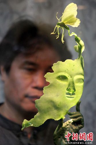 5月6日,台湾玉雕大师黄福寿的代表作《悟》亮相“化母爱为宝岛之爱-送爱到灾区慈善义卖记者会”。该作品取材自一块约30公斤重的碧玉,耗时2年,目前仅1斤重,栩栩如生,令人叫绝。黄福寿称灵感来自禅,“那浅浅的微笑,深藏在玉石里,像是花的绽放”。中新社发 董会峰 摄