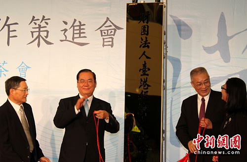 5月26日,台港经济文化合作策进会揭牌仪式在台北举行,将作为港台经济文化合作协进会的对口单位,加强台港之间的经济文化交流。图为台湾“行政院长”吴敦义(右2)、“立法院”副院长曾永权(左2)、“陆委会”主委赖幸媛(右1)、“台港策进会”董事长林振国为之揭牌。中新社发 董会峰 摄