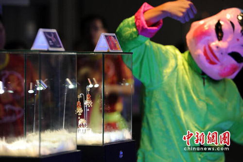 6月24日,亚洲最具规模的珠宝业盛会第二十三届“六月香港珠宝首饰展览会” 盛大开幕,此后4天里,香港会展中心亦因之而金光闪闪。图为当地艺员按传统习俗祈展会兴旺、商家财源广进。中新社发 郑祚声 摄