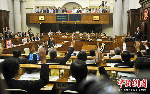 香港特区政府向立法会提交的2012年政改两项议案,获得超过全体议员三分之二多数的赞成票,得以通过。中新社发 邓庆乐 摄
