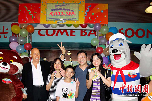 6月25日中午,在香港市民杨国民及其家庭成员踏入公园的一刻,海洋公园正式迎来今年度的第5,033,385位游人,打破入场人次纪录。图为海洋公园主席盛智文[左]欢迎喜迎杨氏一家。中新社发 洪少葵 摄