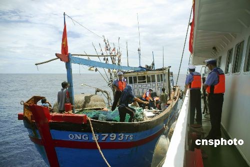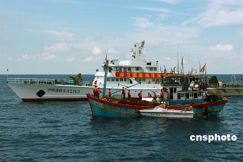 5月26日,广东省渔政总队透露,首次参加西沙巡航的广东渔政两艘现役最大的渔政船,19日组成编队向西沙巡航,截至25日已检查驱逐了5艘外籍侵渔作业渔船。中新社发 齐建军 摄