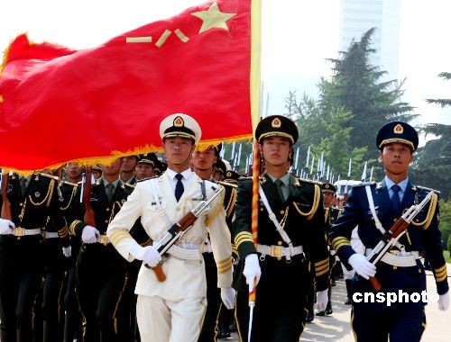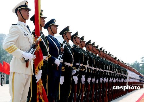 5月26日,中国国务委员兼国防部长梁光烈,在北京八一大楼会见来访的韩国国防部长李相憙,并为其举行欢迎仪式,中国人民解放军三军仪仗队接受中韩国防部长检阅,展现出解放军部队威武之师的军队风采。中新社发 宋吉河 摄