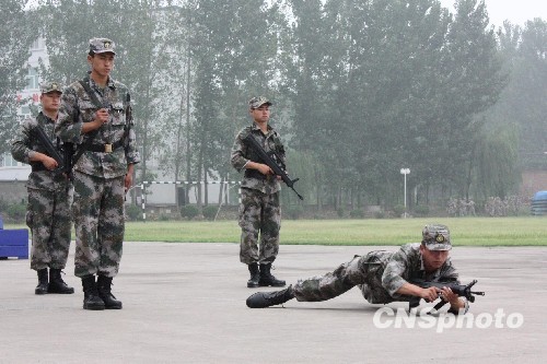 8月11日,河南焦作,中国第三批赴苏丹达尔富尔维和部队士兵在进行射击示范动作训练,以备战赴苏丹达尔富尔维和。该支维和部队共三百一十五名,目前,他们正在接受紧张的针对性、适应性教育训练。将于九月上旬出征苏丹达尔富尔维和。中新社发 王中举 摄