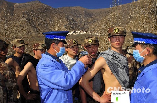 12月10日,驻藏空军雷达某团在接到第一批甲流疫苗后,在第一时间为今冬入伍新兵进行接种。中新社发 郭超英 摄