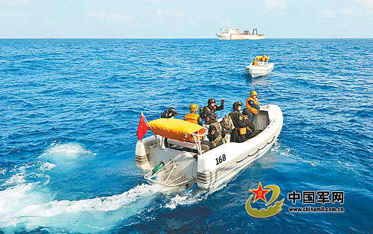 当地时间11日9时,中国海军第五批护航编队“广州”舰上,16名特战队员和2名取证人员全副武装,分别乘直升机和小艇前往“永欢”、“孔雀松”、“龙发”和“华强”等4艘中国商船执行随船护卫任务。本报记者作为摄像取证人员首次与4名特战队员一起,登临中远公司所属的散货船“永欢”号执行为期3天的随船护卫任务。