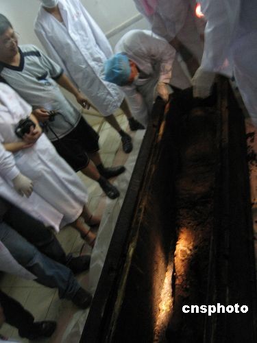 6月9日傍晚,一口据称是目前中国国内发现的密封程度最好、保存最完整、体积最大的“三合土”古棺椁,在广西上思县被专家们抢救性开启,古棺内的尸骸(身)保存较为完整。关于古棺内的具体情况,以及墓葬主人的身份等更多相关资讯,有待专家学者去开展进一步发掘方能“真相大白”。中新社发 杨强 摄