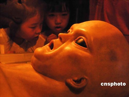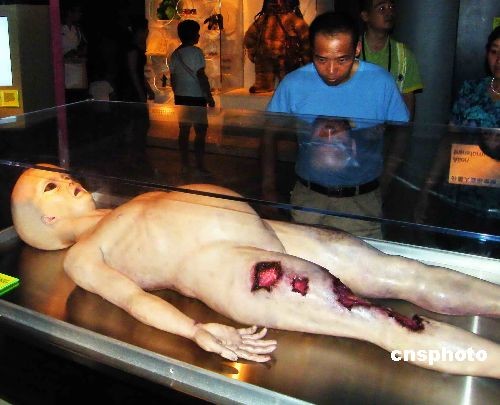 2009年6月15日,英国“外星生命探索展”在上海展出。第一展区内一具“外星人尸体”无不吸引参观者的目光。这个外星人身材矮小,手脚均为六指,左腿上却有一处“血肉模糊”,仿佛刚被解剖。中新社发 井韦 摄