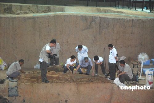 在秦俑一号坑第三次考古发掘中,考古工作者近日新发现两件残留有彩绘的陶俑,分属高级军吏俑和武士俑。图为七月十三日,第三次发掘开始一个月后,原秦俑博物馆馆长袁仲一、执行领队许卫红等在研究出土文物。中新社发 冽玮 摄