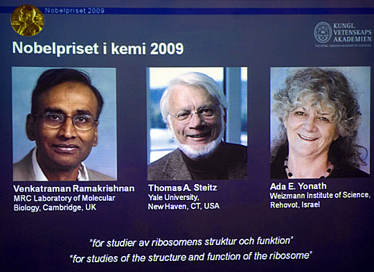 瑞典皇家科学院10月7日宣布,万卡特拉曼-莱马克里斯南(Venkatraman Ramakrishnan) 、托马斯-施泰茨(Thomas Steitz) 和阿达-尤纳斯(Ada Yonath)因对“核糖体结构和功能的研究”做出突出贡献而获得2009年诺贝尔化学奖。