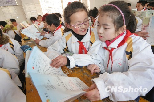 2月22日,江苏省赣榆县中小学开学第一天,学生在教室里阅读新领到的免费教科书。今年春季开学,赣榆县教育部门将价值2425万元的免费教科书和各种教辅用书全部发放到农村中小学生和城区贫困学生手中。 中新社发 司伟 摄