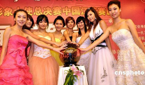 6月28日,2009世界旅游形象大使总决赛中国江苏赛区比赛在南京启动,开始接受选手报名。图为新闻发布会上,8名模特前来助阵。中新社发 刘小楚 摄