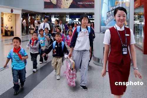 5月14日,来自四川地震灾区绵阳、都江堰、彭州等地的20名失去父母的孩子,乘坐飞机从成都出发前往北京,15日转机赴韩国首尔参访。15日至19日,他们将出席韩方举办的见面会、交流会等活动,参观学校、福利院等。图为服务员引导孩子们在成都登机。中新社发 肖娟 摄