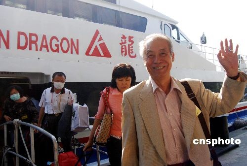 5月15日,乘坐“小三通”轮船的台胞抵达福建省厦门市。参加海峡论坛的八千多名台胞将陆续抵达厦门。中新社发 傅丹丹 摄