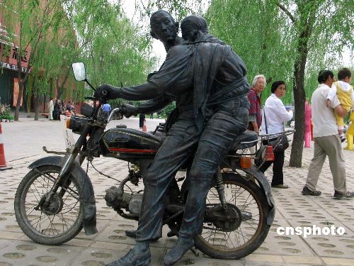 2008年5.12汶川大地震中痛失妻子的一名中国农民,用绳子将亡妻尸体绑在背部驾驶摩托车送她返乡的故事曾经感动世人,现今其形像经人制作成雕像在北京蟹岛绿色生态农庄雕塑园展出。中新社发 邹宪 摄